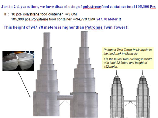 Use Reusable Tupperware Instead of Polyestrene For All OT Food Supplied To WorkerDiscarded polystyrene does not for hundreds of years. Wide using of Polystyrene is not only burying our earth wt polystyrene but also harm to our health. According to scientist when hot food or beverages are placed in polystyrene containers, the styrene chemicals leech from the containers into your food and then into your body. Over time, this can lead to reproductive issues or even cancer. Therefore, in consider environment and health, we’re 100 percent fully support to abandon using polystyrene food container. For all the OT food we supplied to worker, we have using the reusable Tupperware instead of polystyrene.